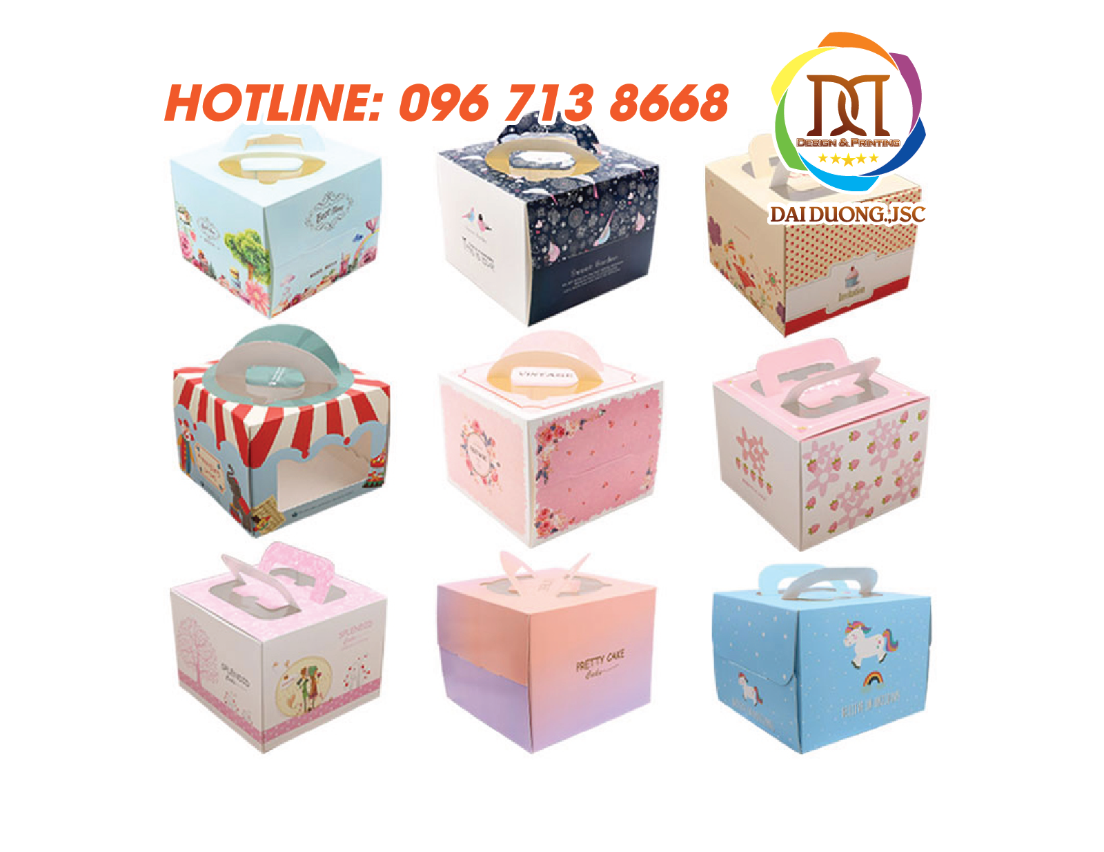 Chỉ cần bạn chọn mẫu hộp phù hợp, gửi thông tin muốn in như logo, tên tiệm, lời chúc hay hình ảnh, chúng tôi sẽ nhanh chóng in lên vỏ hộp đúng yêu cầu, đảm bảo thẩm mỹ, chuyên nghiệp và tiết kiệm thời gian tối đa cho bạn.