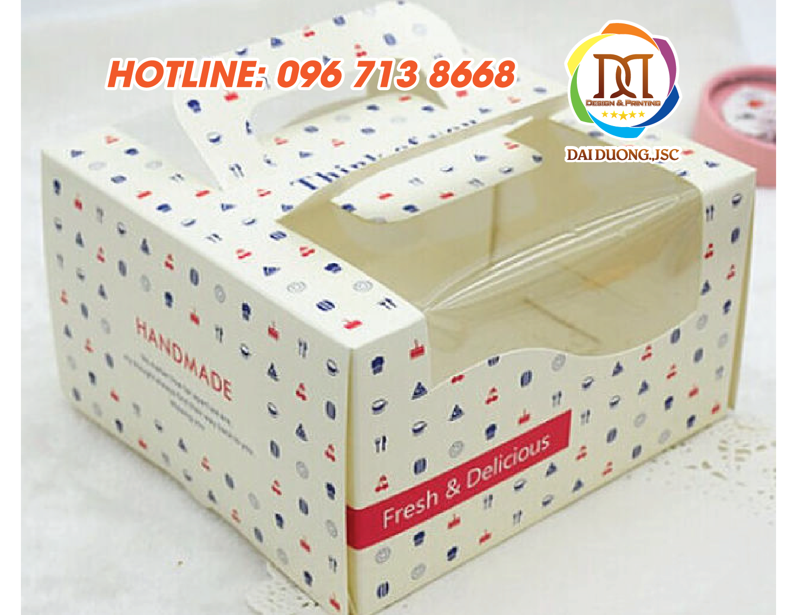 Chỉ cần bạn chọn mẫu hộp phù hợp, gửi thông tin muốn in như logo, tên tiệm, lời chúc hay hình ảnh, chúng tôi sẽ nhanh chóng in lên vỏ hộp đúng yêu cầu, đảm bảo thẩm mỹ, chuyên nghiệp và tiết kiệm thời gian tối đa cho bạn.